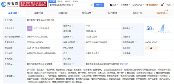 天眼查APP數據顯示,4月13日,重慶榮昌江哥食品科技有限公司正式成立,該公司法定代表人為林江,註冊資本100萬人民幣。其經營範圍涵蓋食品生產、食品銷售、餐飲服務、家禽屠宰等。