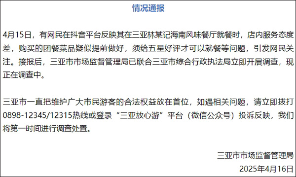 微信公眾號“三亞市市場監督管理局”4月16日發佈情況通報稱,4月15日,有網民在抖音平台反映其在三亞林某記海南風味餐廳就餐時,店內服務態度差,購買的團餐菜品疑似提前做好,須給五星好評才可以就餐等問題,引發網民關注。接報後,三亞市市場監督管理局已聯合三亞市綜合行政執法局立即開展調查,現正在調查中。