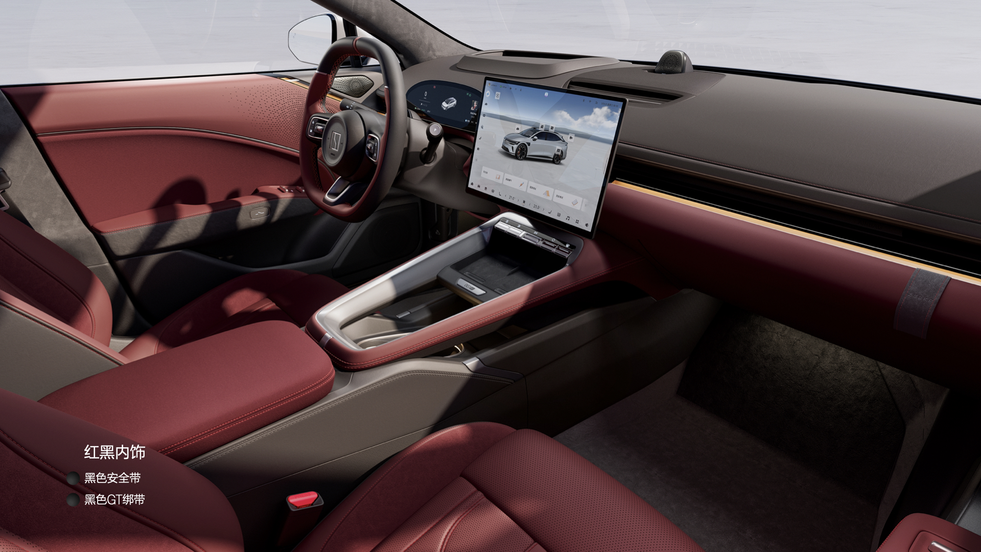 進入內部,極氪007GT全車大面積採用軟質包覆,頂棚和ABC柱採用超纖絨材質包覆,座椅採用仿麂皮拼接包覆,配以撞色安全帶、GT專屬徽標和專屬綁帶等個性化點綴。
