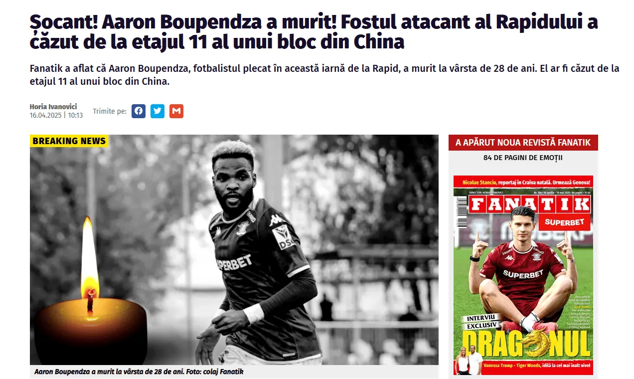 4月16日,據土耳其媒體Fanatik消息,效力於中超浙江隊的28歲加蓬國腳阿隆·布彭扎(Aaron Boupendza)從一棟公寓11層墜落身亡,該消息得到了羅馬尼亞多位消息人士的證實。目前,布彭扎墜樓原因尚不清楚。