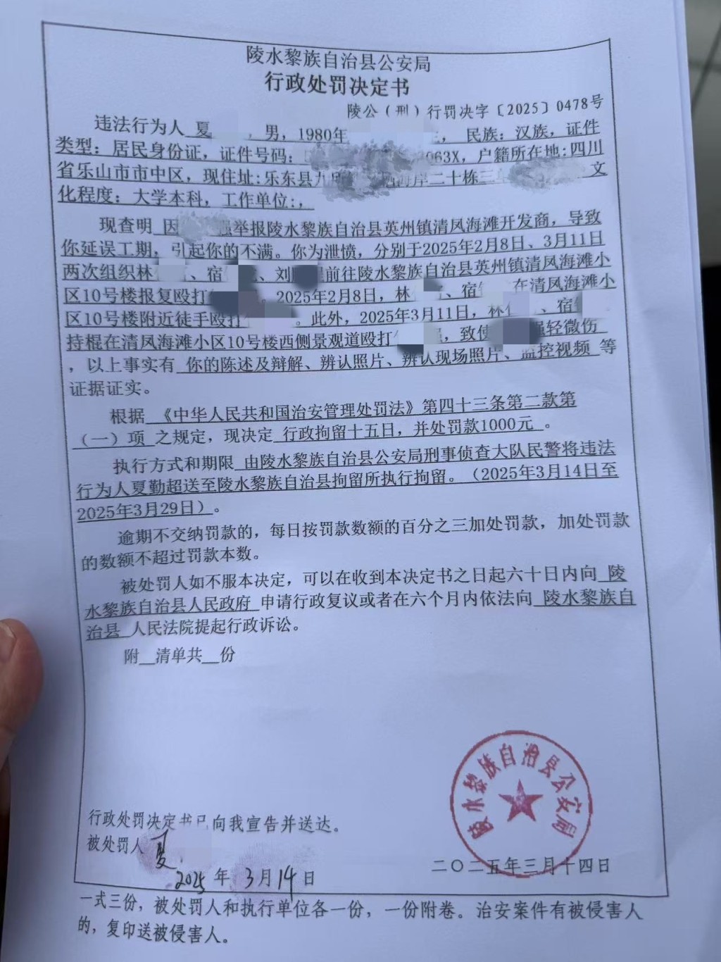 警方出具的4份行政處罰決定書顯示,4名違法行為人分別是夏某、林某、宿某和劉某,4人全部是四川人。生於1980年的夏某是四川樂山人。警方據口供,夏某因蔣正義舉報清鳳海灘(注:處罰決定書原文,應為清鳳海棠長灘)開發商,導致其延誤工期,引起他的不滿。為泄憤,夏某於2025年2月8日、3月11日兩次組織手下工人林某、宿某、劉某到長灘小區報復蔣正義。其中,兩次行兇的均是林某、宿某,劉某負責蹲守。目前,夏某和宿某被警方處以行政拘留15日,並處罰款1000元。劉某和林某被處行政拘留10日,罰款500元。