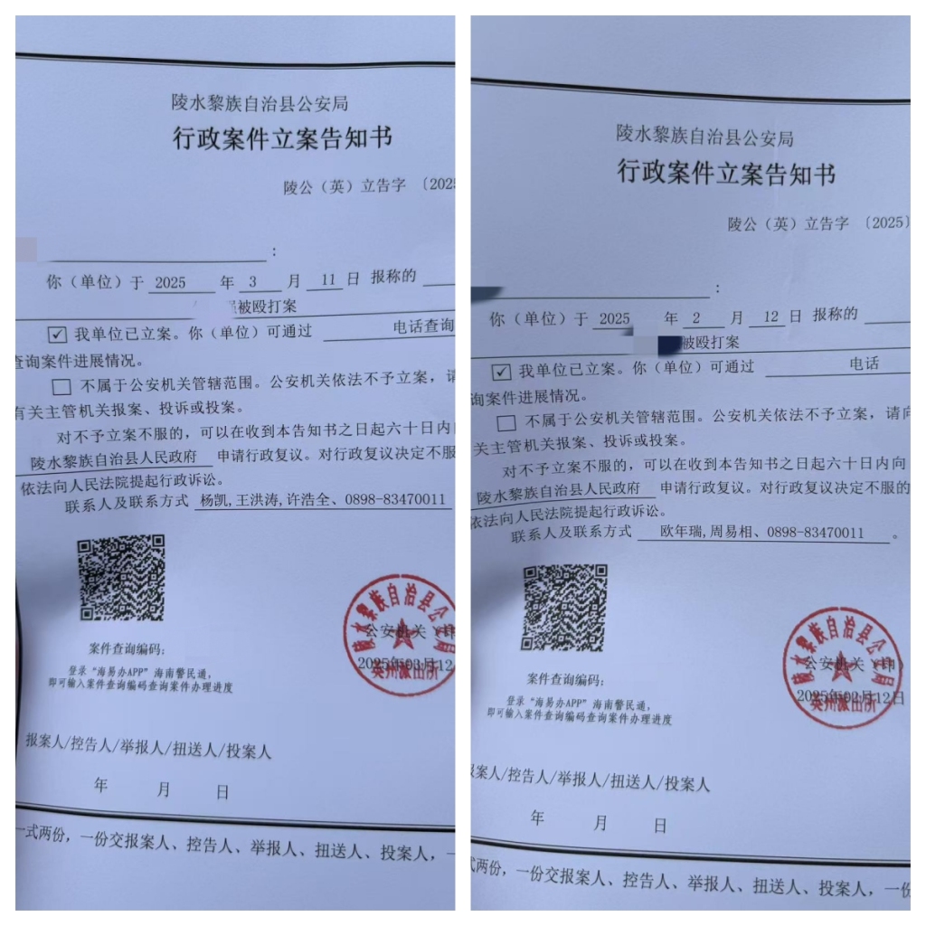 蔣正義也對這三起接連發生的“意外事件”進行報案,其中2月8日遭偷襲毆打、黃某平涉嫌尋釁滋事兩起案件,由陵水縣公安局英州派出所處理,派出所也對兩起案件立為行政案件進行調查。