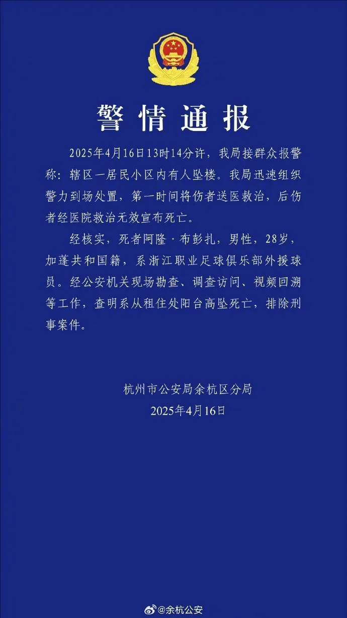 據微博@餘杭公安 消息,杭州市公安局餘杭區分局16日晚發佈警情通報:中超浙江隊外援球員阿隆·布彭扎墜樓身亡,經公安機關現場勘查、調查訪問、視頻回溯等工作,查明系從租住處陽台高墜死亡,排除刑事案件。