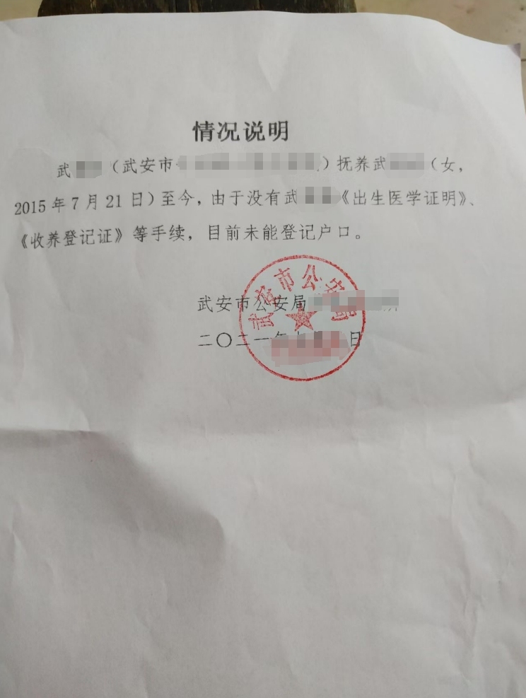 2021年7月,為解決小丫上學問題,轄區派出所為黃麗開具了《情況説明》:黃麗撫養小丫(女,2015年7月21日出生)至今,由於沒有小丫的《出生醫學證明》、《收養登記證》等手續,目前未能登記户口。