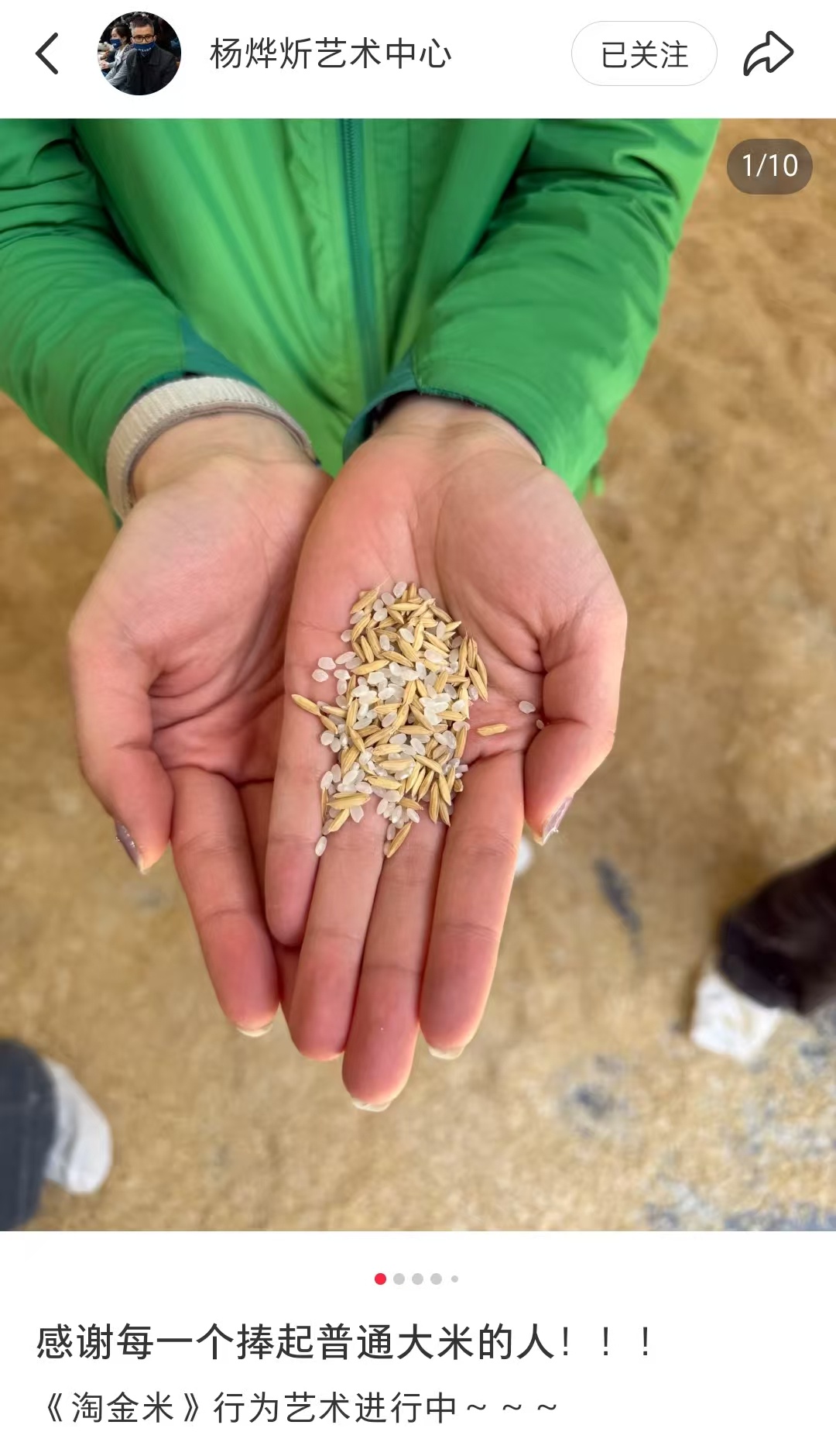 《淘金米》藝術展於3月30日在北京開展,藝術家楊燁炘當場將500克黃金打造出的1000粒黃金大米撒入總計5噸的大米中,參觀者被邀請進入這個佔地200多平方米的 “糧倉”淘金,幸運兒可以帶走自己淘得的黃金米。