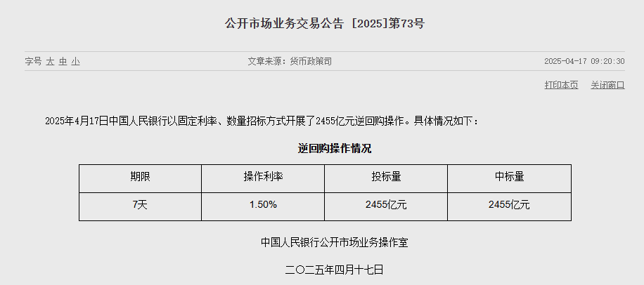 據中國人民銀行網站消息,2025年4月17日中國人民銀行以固定利率、數量招標方式開展了2455億元逆回購操作,期限7天,操作利率利率為1.5%。