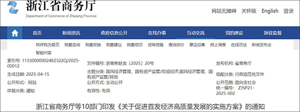 據浙江省商務廳網站4月17日消息,浙江省商務廳等10部門印發《關於促進首發經濟高質量發展的實施方案》的通知。