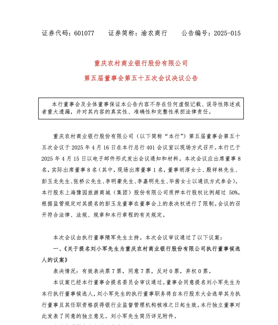 4月16日,重慶農村商業銀行股份有限公司(簡稱“渝農商行”)(601077.SH)發佈公告稱,該行召開第五屆董事會第五十五次會議,審議通過《關於選舉劉小軍為重慶農村商業銀行股份有限公司董事長的議案》。劉小軍的董事長任職資格自該行股東大會審議通過其擔任該行執行董事且獲國家金融監督管理總局重慶監管局核准之日起生效,至本屆董事會任期屆滿為止。