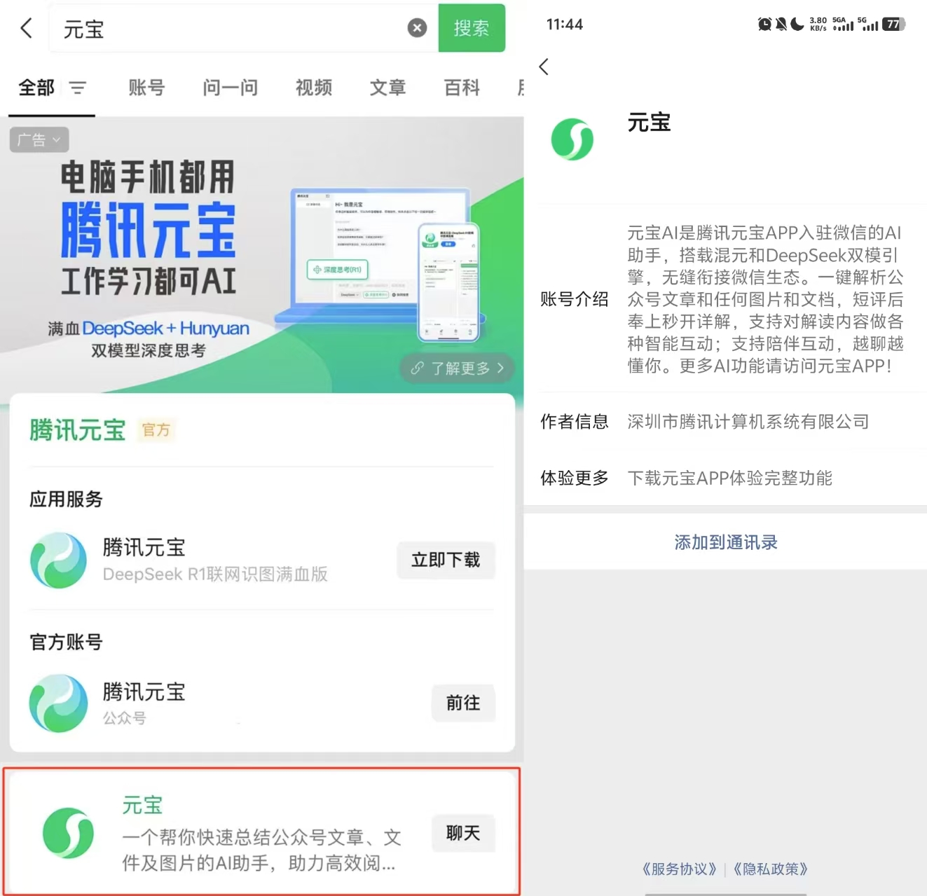 4月16日,微信上線新功能,用户能在微信添加騰訊元寶為好友。