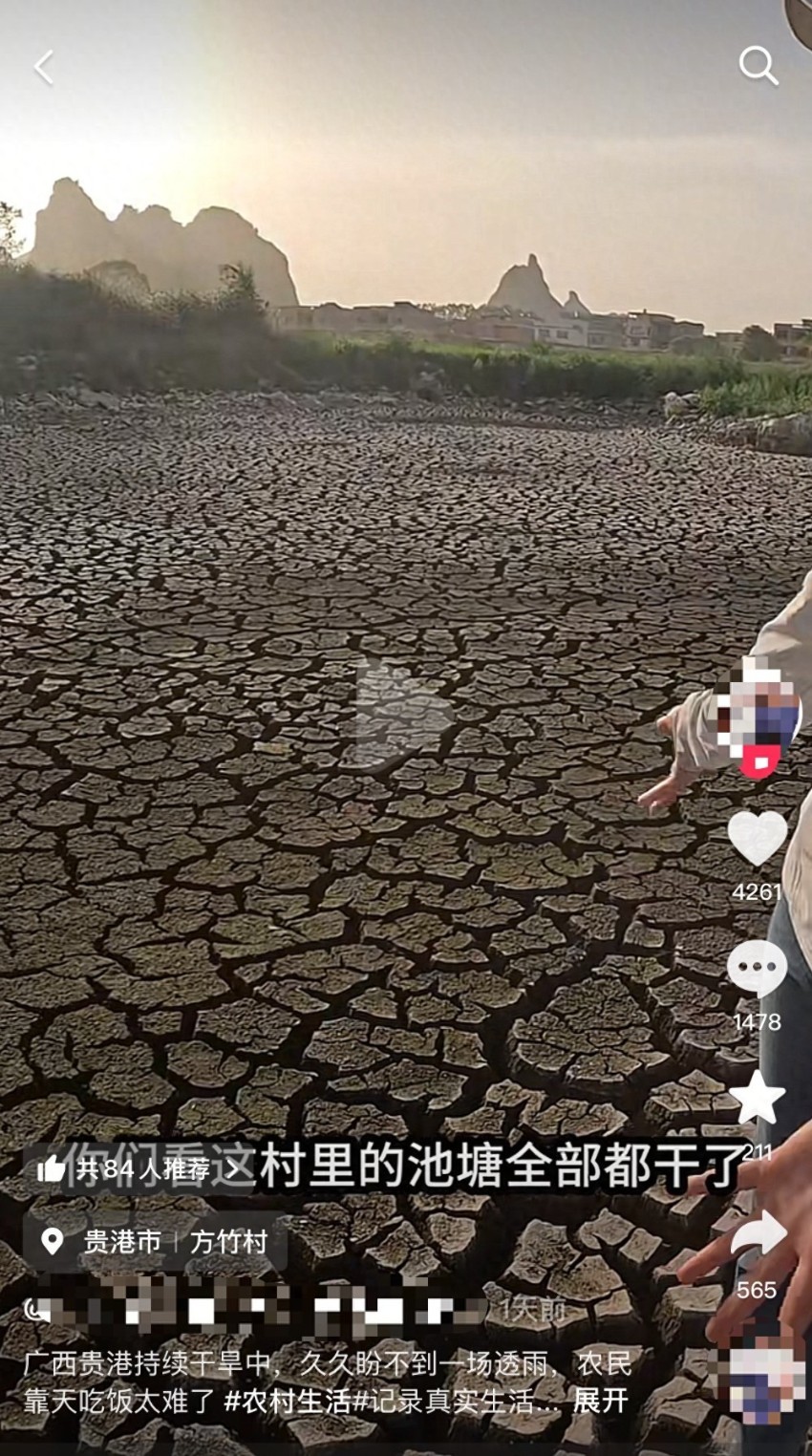 據九派新聞報道,近日,廣西貴港市農村地區持續乾旱引發關注。該市覃塘區石卡鎮方竹村一村民拍攝的視頻顯示,村裏的池塘已經完全乾涸,地表佈滿拳頭大小的裂縫。