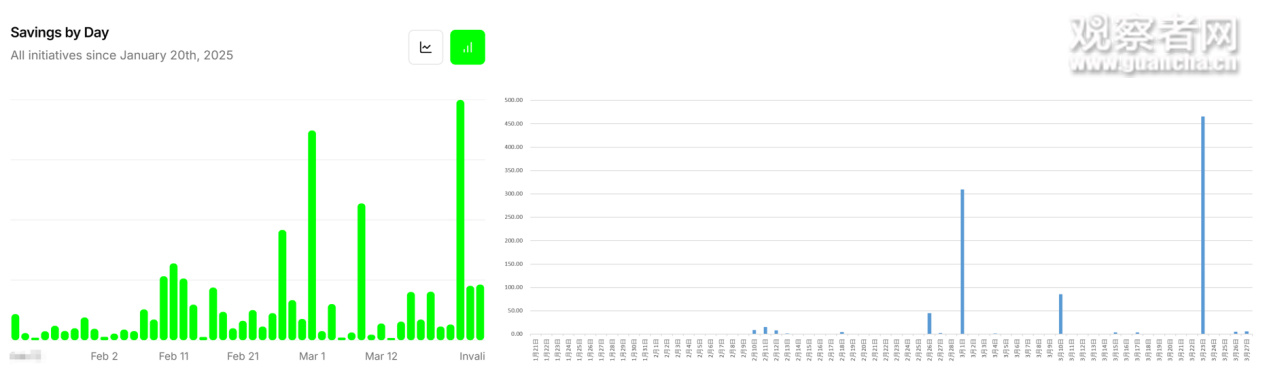 截至4月7日,DOGE官網已公示的每日削減開支圖(左),及根據其數據重新繪製圖(右)對比,同樣的數據,圖表差異巨大。 圖表來源:作者自制。