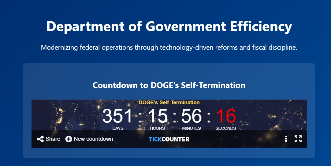 待到特朗普正式就任總統,他所簽署的行政令就是“政府效率部”將存續18個月,馬斯克還為此做了一個“DOGE自我終結”的倒計時牌,煞有其事地表示:“‘政府效率部’的最後一項工作就是裁撤自己。”