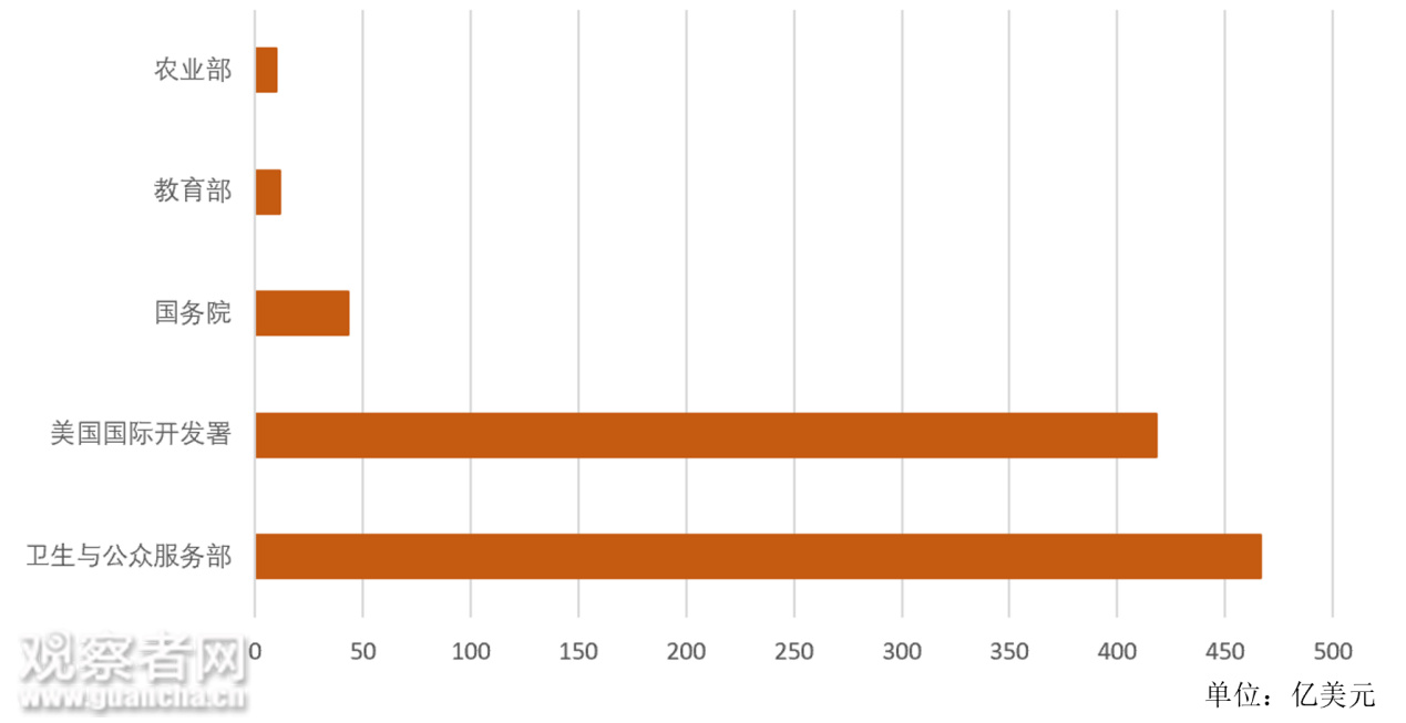 在DOGE官網上,為我們展示的各部門削減經費情況也出現了嚴重的失衡,在目前DOGE號稱削減的1400億美元經費中,美國國際開發署(USAID)與美國衞生與公眾服務部 (HHS)佔比就達2/3,遙遙領先於各部門。