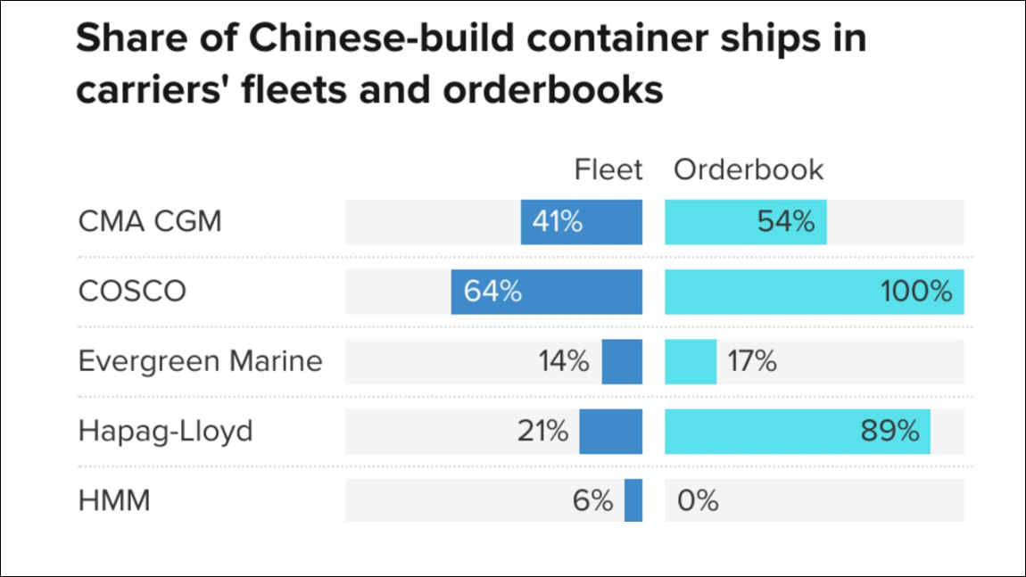 美國航運公司高度依賴中國製造的船舶。NBC製圖