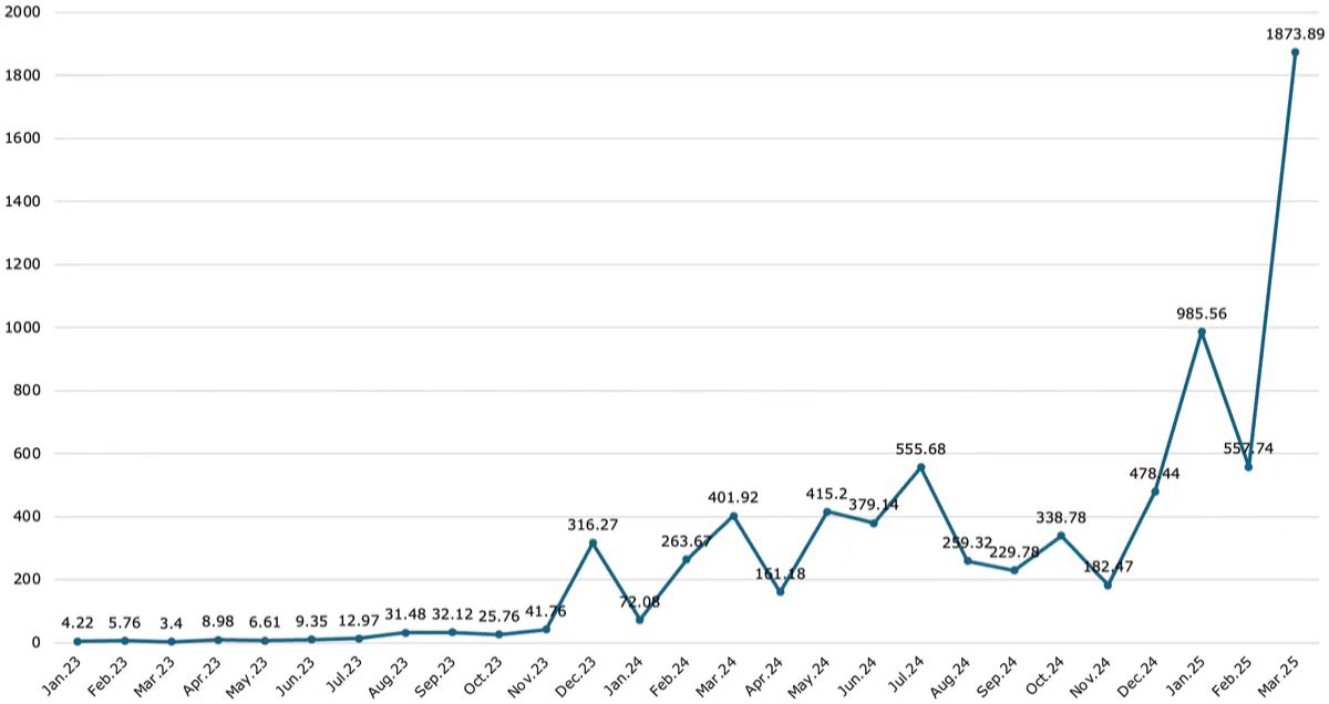 分析師Lennart Heim發現的數據顯示,2025年3月,中國台灣地區對馬來西亞的計算機系統出口額達18.74億美元(約合人民幣136.89億元),而去年3月出口額僅為4.02億美元(約合人民幣29.36億元),同比增長366%,相較於2023年3月的340萬美元(約合人民幣2487萬元)更是大幅增長55117%。