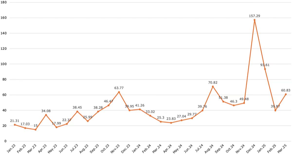數據顯示,馬來西亞企業不僅向中國台灣進口人工智能服務器,還加快了採購零部件如英偉達H100的步伐。2025年3月,中國台灣地區對馬來西亞的計算機零部件出口額增至6083萬美元(約合人民幣4.4億元),高於2023年3月的2704萬美元(約合人民幣1.98億元)和去年同期的1500萬美元(約合人民幣1.1億元)。