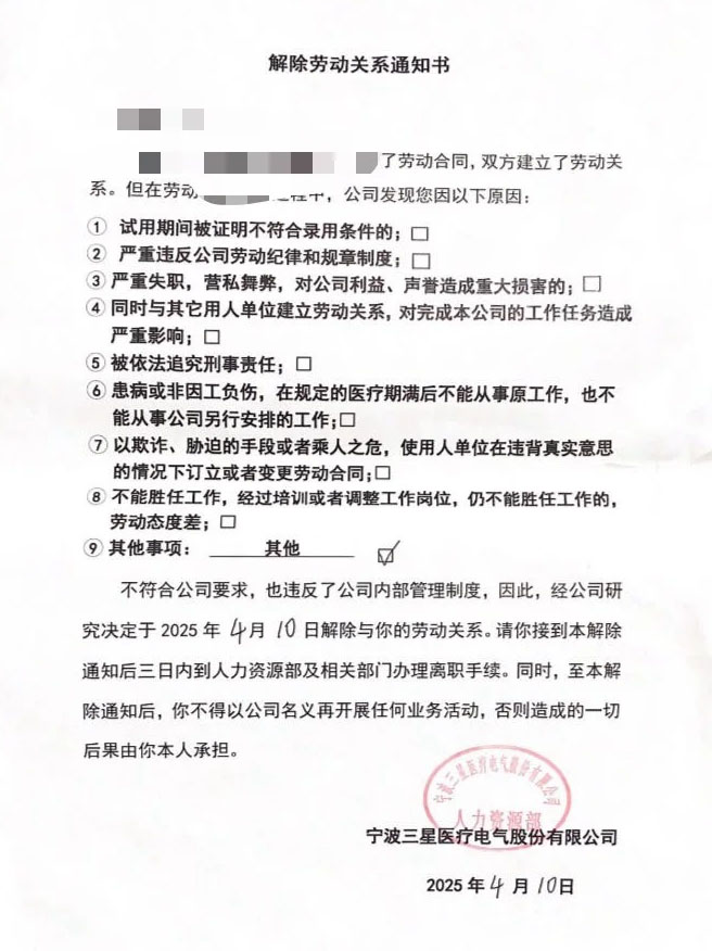 一份來自寧波三星醫療電氣股份有限公司(下稱“三星醫療”)的《解除勞動關係通知書》顯示,其發給員工的裁員原因是“其他”,並要求員工三日內辦理離職手續。