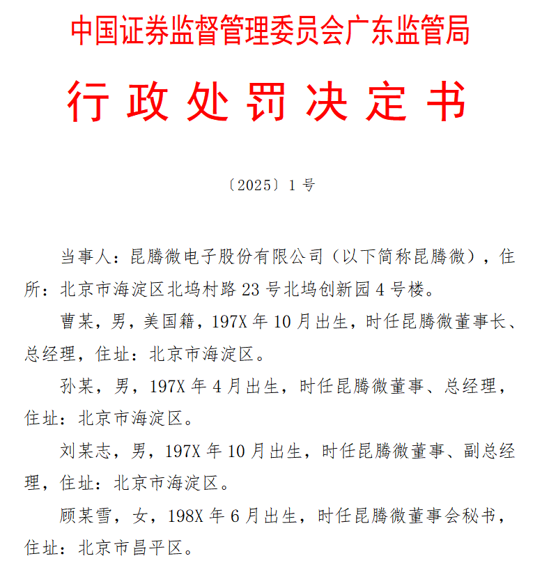 近日,中國證券監督管理委員會廣東監管局發佈了對昆騰微電子股份有限公司(以下簡稱“昆騰微”)及其相關高管的行政處罰決定書,該公司及相關高管違反了《證券法》及《招股説明書》相關細則,被責任改正,給予警告,並處以合計960萬元罰款。