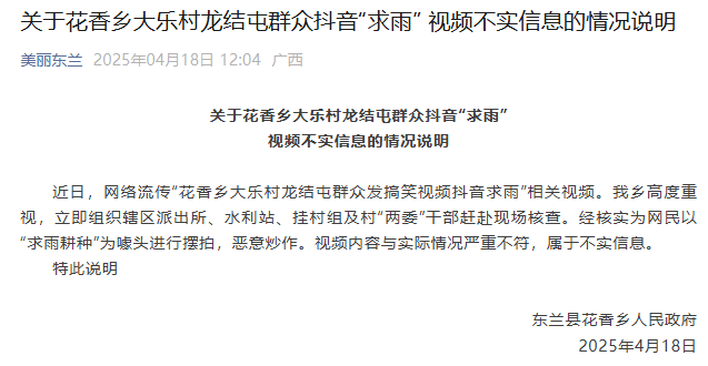 據廣西河池東蘭縣融媒體中心官方微信公眾號“美麗東蘭”消息,東蘭縣花香鄉人民政府4月18日發佈關於花香鄉大樂村龍結屯羣眾抖音“求雨” 視頻不實信息的情況説明:
