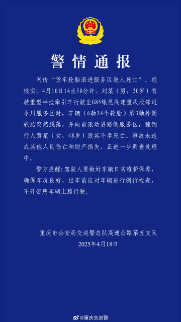 4月18日,@重慶交巡警 官方微博發佈警情通報:網傳“貨車輪胎滾進服務區致人死亡”。經核實,4月10日14點50分許,劉某(男,30歲)駕駛重型半掛牽引車行駛至G85銀昆高速重慶段鄰近永川服務區時,車輛(6軸24個輪胎)第3軸外側輪胎突然脱落,並向前滾動進路側服務區,撞倒行人黃某(女,48歲)致其不幸死亡。事故未造成其他人員傷亡和財產損失,正進一步調查處理中。