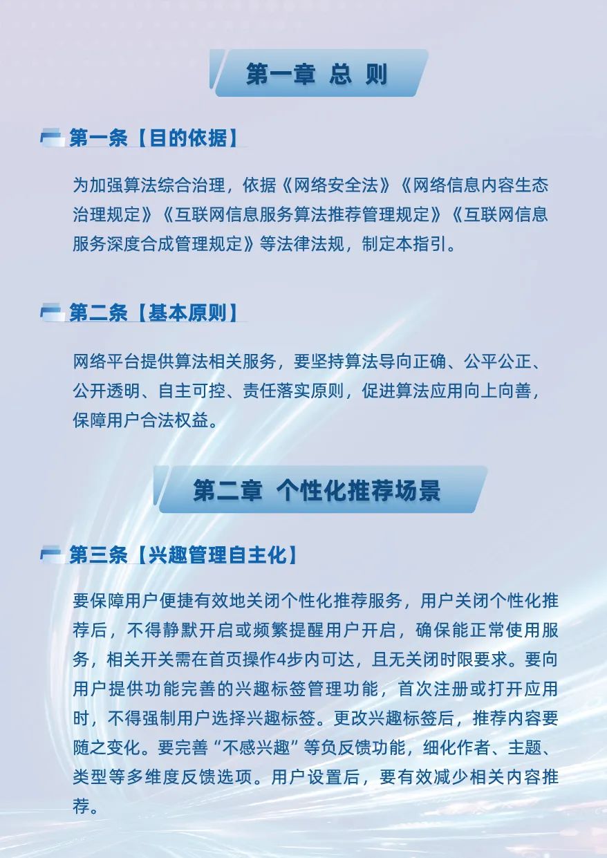 個性化推薦場景中,《指引》聚焦 “興趣管理自主化、推薦內容清朗化、標籤體系精細化” 三個方向,明確要求平台清晰提示用户 4步操作內 可便捷關閉個性化推薦,為用户提供 “不感興趣”按鈕、興趣標籤管理功能,把“算法開關”交到用户手中;引入更多正向合規指標,構建科學的流量分發機制,積極傳播優質內容、抑制負向內容,進一步提升推薦內容的多樣性豐富性。