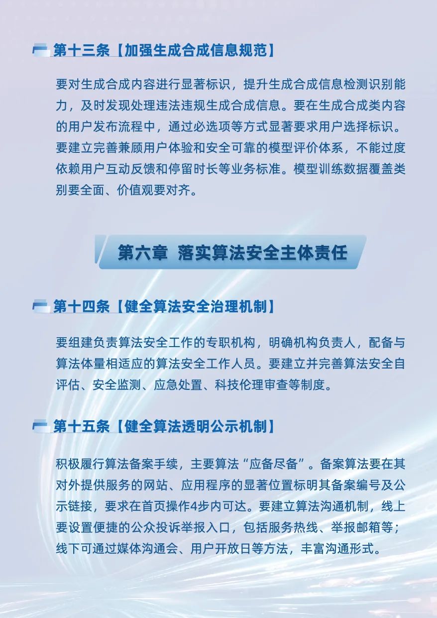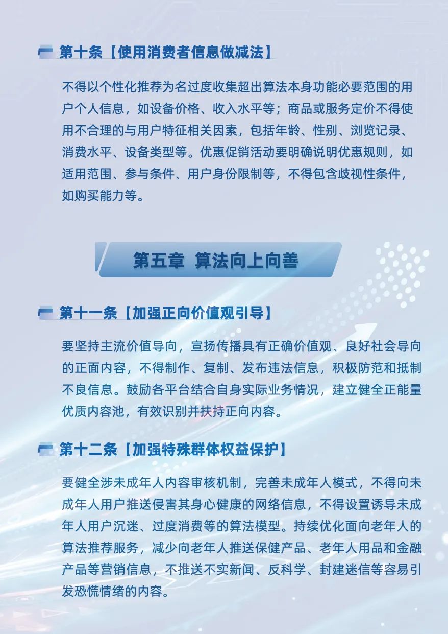 《指引》圍繞個性化推薦、熱搜榜單、調度決策等算法場景,針對 “信息繭房”、違規操縱熱搜榜單、 騎手 “困在算法裏” 、大數據 “殺熟”等社會關注度高的算法典型問題,向屬地網絡平台提出16條合規要求,強調要堅持算法導向正確、公平公正、公開透明、自主可控、責任落實原則,促進算法應用向上向善,保障用户合法權益。