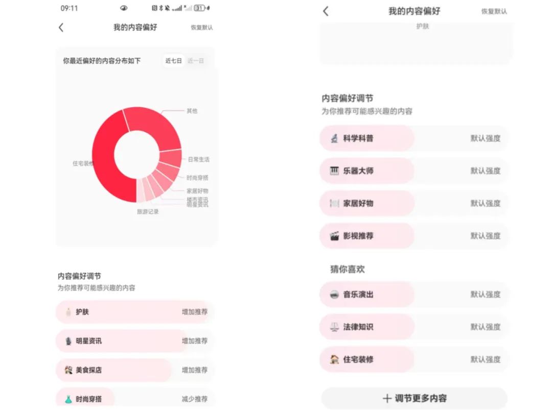 小紅書 : 用户可通過【設置-內容偏好調節】進入“我的內容偏好” 版塊 , 查看近七日和近一日的偏好內容分佈情況餅狀圖。在此版塊中 ,用户還可自主調節內容偏好,選擇自己喜歡的內容領域。