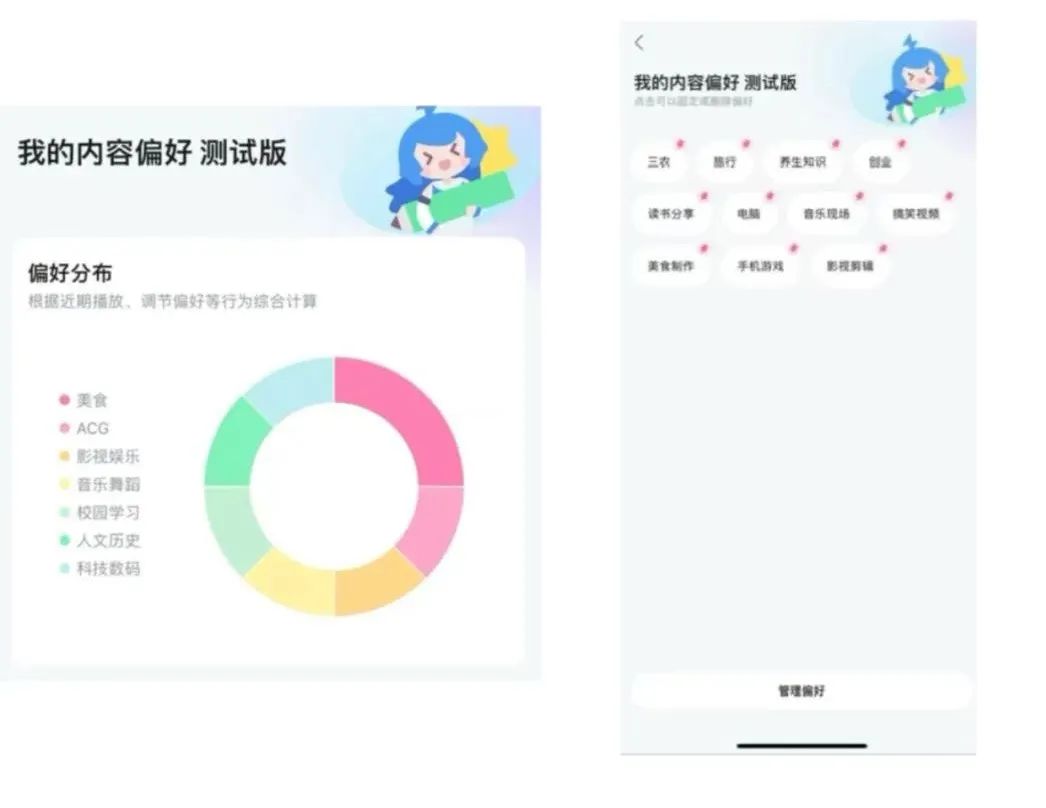 嗶哩嗶哩 : 用户可通過【設置 -隱私權限設置-個性化內容推薦管理】進入“我的內容偏好” 版塊 ,通過偏好分佈餅狀圖直觀地感受自己目前的 “信息繭房”程度。在此版塊 中,用户也可以自主管理自己的個性化標籤。