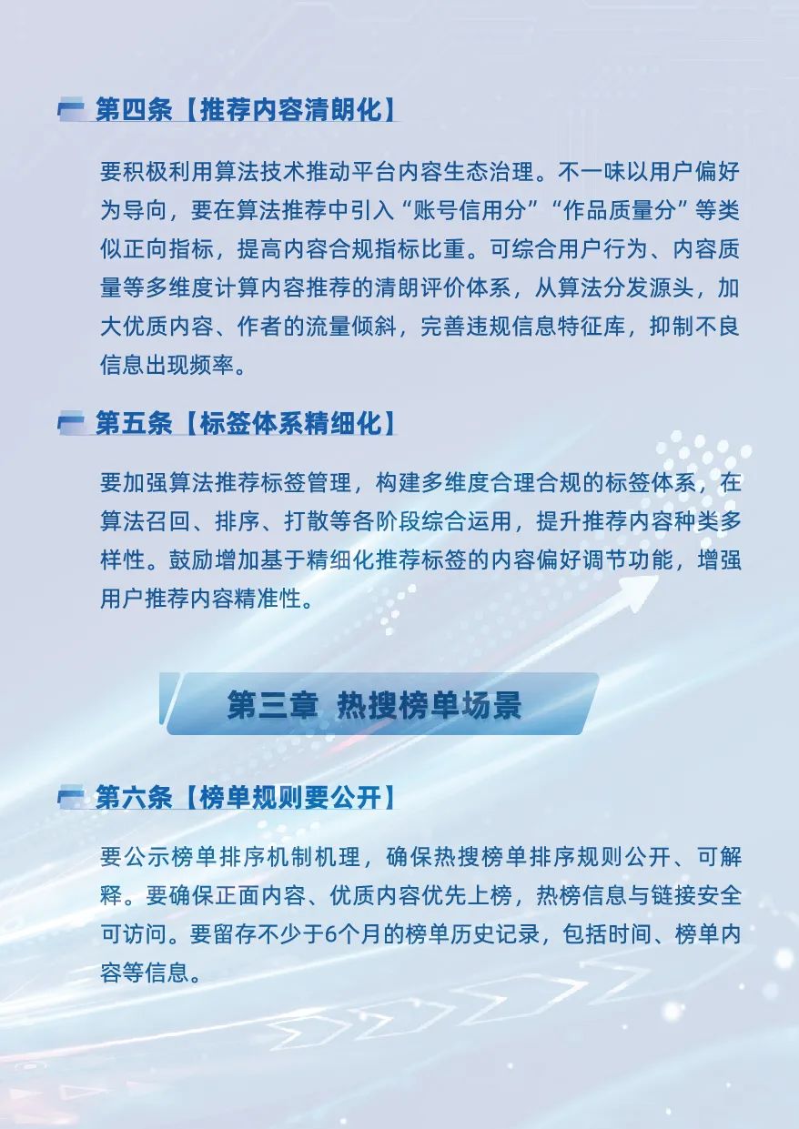 熱搜榜單場景中,《指引》提出 “榜單規則要公開、刷單行為要管控、榜單呈現要優化” 三方面指導意見,明確要求平台通過 顯著位置 公示熱搜榜單排序原理,提升榜單透明度和可解釋性;藉助技術手段,及時處置水軍刷榜等異常行為,維護榜單公正;加強榜單內容管理,減少不良導向內容上榜,防範使用不文明語言。
