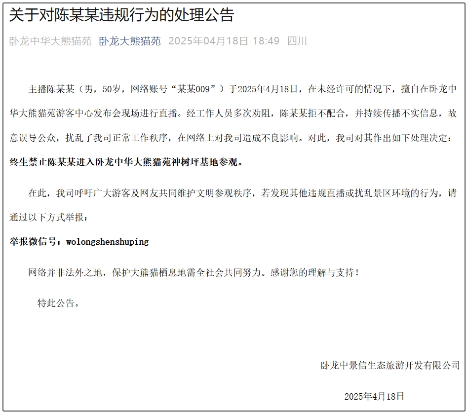 主播陳某某(男,50歲,網絡賬號“某某009”)於2025年4月18日,在未經許可的情況下,擅自在卧龍中華大熊貓苑遊客中心發佈會現場進行直播。經工作人員多次勸阻,陳某某拒不配合,並持續傳播不實信息,故意誤導公眾,擾亂了我司正常工作秩序,在網絡上對我司造成不良影響。對此,我司對其作出如下處理決定:終生禁止陳某某進入卧龍中華大熊貓苑神樹坪基地參觀。