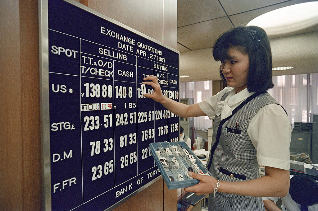 當地時間1987年4月27日,日本東京,證券交易所,一名銀行職員在公告板上展示新的匯率,此時美元跌至戰後最低水平。視覺中國