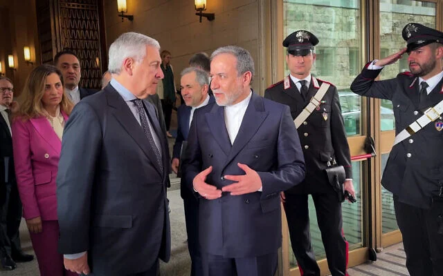 當地時間19日伊美核問題談判前,意大利副總理兼外長塔亞尼(左)與阿拉格奇會面。法新社