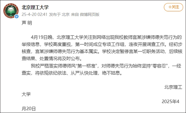 4月20日,@北京理工大學 發佈聲明稱, 4月19日晚,北京理工大學關注到網絡出現該校教師宮某涉嫌師德失範行為的舉報信息,學校高度重視,第一時間成立專項工作組,連夜開展調查工作。經初步核查,宮某涉嫌師德失範行為基本屬實。學校決定暫停宮某一切職務活動,後續核查結果、處置情況將及時公佈。
