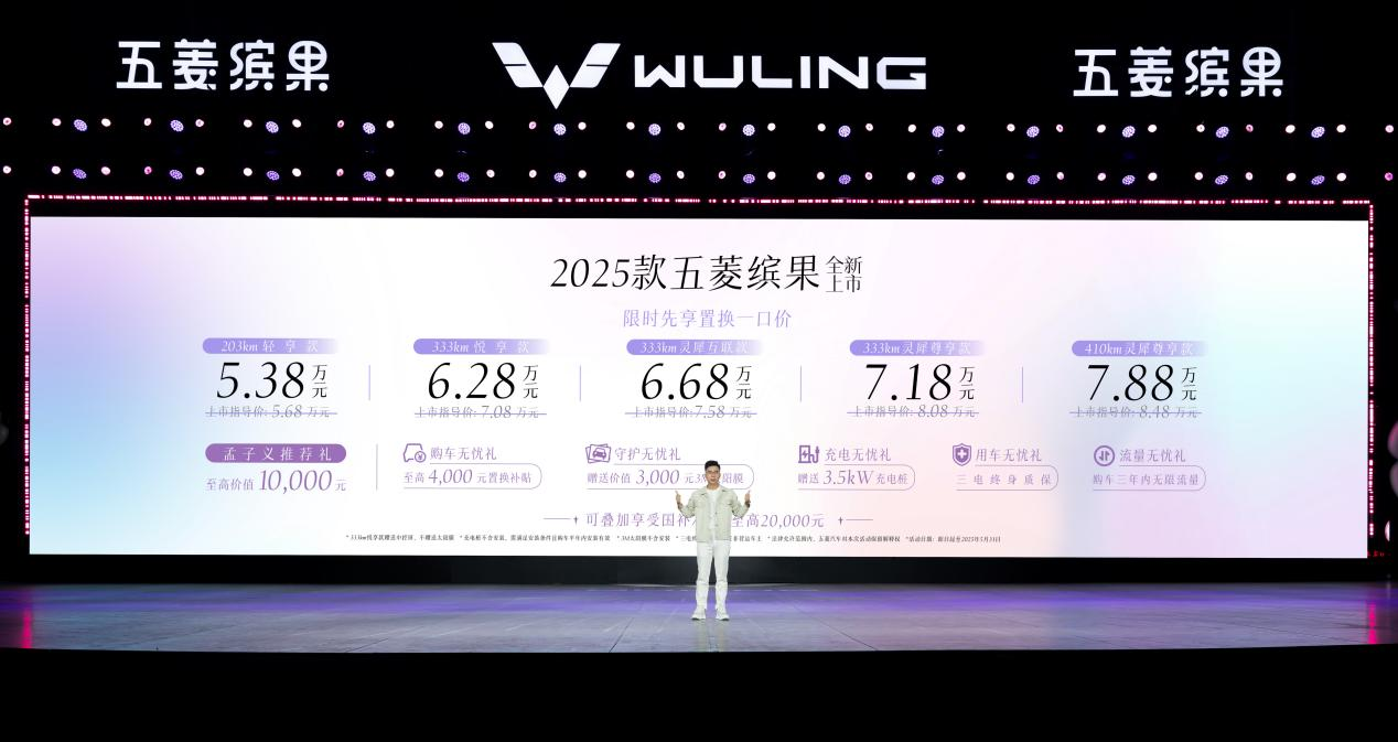 【文/觀察者網 潘昱辰 編輯/高莘】4月19日,2025款五菱繽果正式上市。新車共推出五個配置,官方指導價為5.68萬—8.48萬元;上市當日至5月31日,限時置換一口價為5.38萬—7.88萬元。