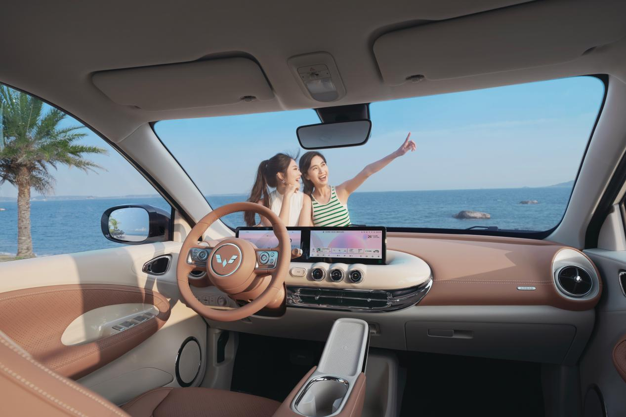 進入內部,2025款五菱繽果內飾選用焦糖咖/果殼棕美拉德拼色內飾,並通過大面積的皮質包覆、高亮鍍鉻、高亮烤漆的搭配,使整車更為精緻。此外,新車升級懷擋設計,配備雙10.25英寸懸浮高清大聯屏,搭載Ling OS操作系統,提供多項遠程操控功能配置。