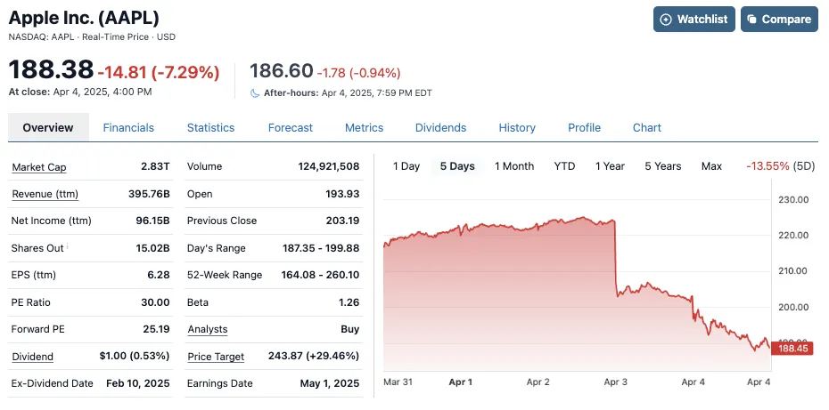 在對“AI泡沫”的反思露出苗頭的情況下,特朗普非但不管不顧,反而推出了針對150多個國家和地區的“對等關税”政策,把自己搞成了黑天鵝。這麼做在刺破“AI泡沫”的同時,也極大地威脅了美國跨國公司用近半個世紀才建立起來的盈利模式,蘋果公司將如何規避關税帶來的業績負面衝擊?英偉達(交易代碼:NVDA)和蘋果公司(交易代碼:AAPL)的估值還適用於25倍的估值嗎?市場對這個問題充滿了疑慮。於是,在特朗普關税大棒落地後,我們看到了美國三大股指權重股引領的暴跌潮,三大股指跌幅似有刷新2020年熔斷機制的傾向。