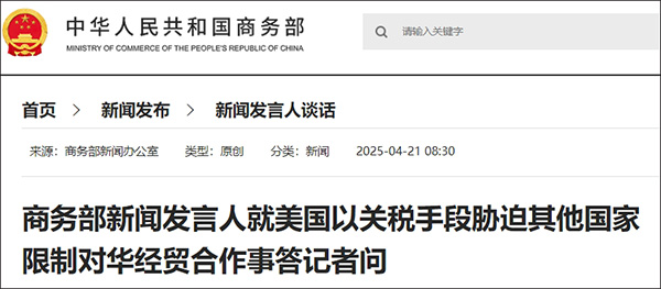 據商務部網站4月21日消息,商務部新聞發言人就美國以關税手段脅迫其他國家限制對華經貿合作事答記者問。