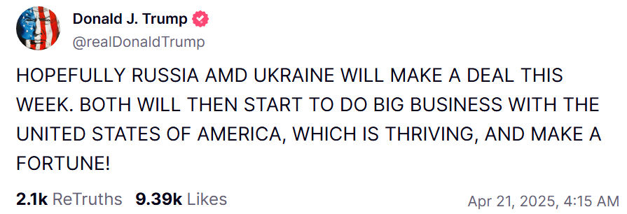 “希望俄羅斯和烏克蘭本週能達成協議。然後雙方都開始和蓬勃發展的美國做大生意,並大賺一筆!”特朗普當日在“真實社交”平台寫道。