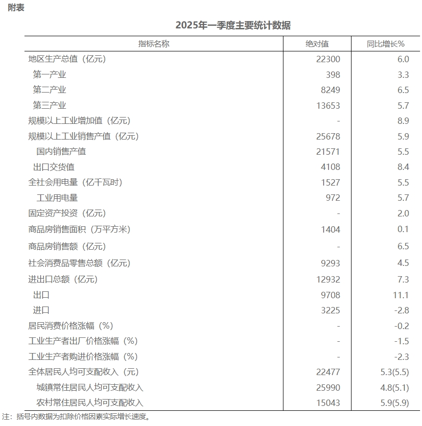 根據地區生產總值統一核算結果,一季度全省地區生產總值22300億元,按不變價格計算,同比增長6.0%。分產業看,第一產業增加值398億元,增長3.3%;第二產業增加值8249億元,增長6.5%;第三產業增加值13653億元,增長5.7%。