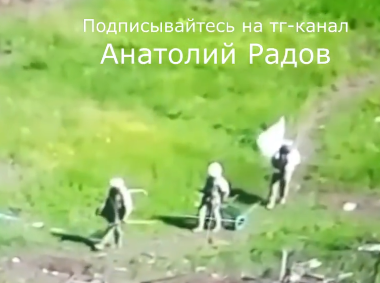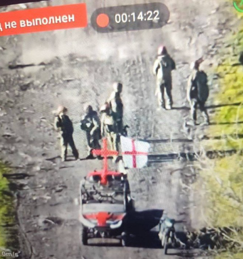 俄軍士兵攜帶白色紅十字旗收斂遺體(上圖),烏軍攜帶白旗收斂遺體社交媒體