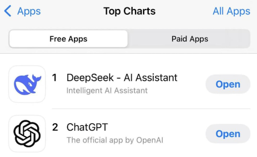 1月27日,DeepSeek登頂蘋果美國地區應用商店免費APP下載排行榜