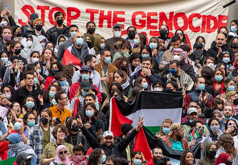 當地時間2023年10月14日,美國馬薩諸塞州,巴勒斯坦支持者聚集在哈佛大學,以示對加沙地帶巴勒斯坦人的支持。視覺中國