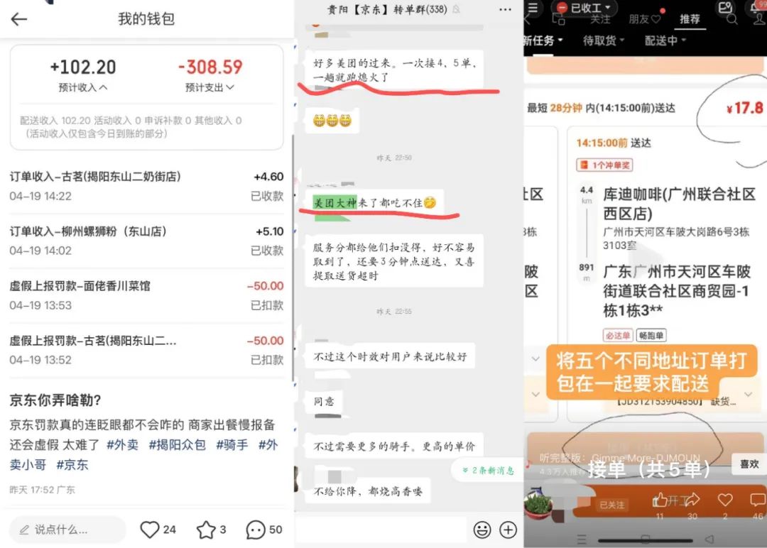某平台配送時限過短、全職騎手數量不足、兼職騎手被區別對待,加上罰款嚴重,將不同地址非順路多筆訂單打包捆綁要求配送等問題,導致騎手不願加入,延誤問題高發,用户體驗受損。如,有美團騎手錶示,“ 美團大神來了都吃不住”。