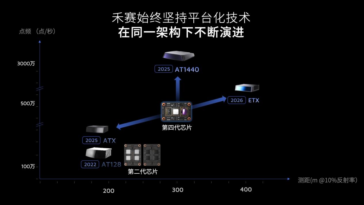 據悉,禾賽科技目前採用芯片化與平台化雙戰略。通過自主設計研發的芯片,禾賽科技轉變了傳統激光雷達的分立式技術路徑,成功縮小了激光雷達的體積並且提升了點雲密度。在科技日上,禾賽科技發佈了其第四代芯片平台,此平台下的新產品可以實現對複雜環境更高的感知精度和超遠距探測能力。