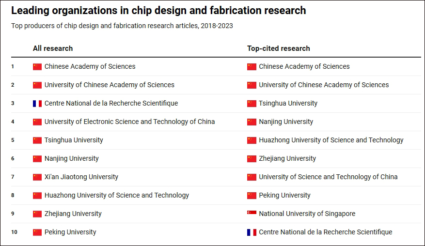 從具體機構來看,在芯片設計和製造研究領域的領先組織(根據論文總數),中國前十佔九,除排名第三的法國國家科學研究中心外,其他依次為中國科學院、中國科學院大學、電子科技大學、清華大學、南京大學、西安交通大學、華中科技大學、浙江大學和北京大學。