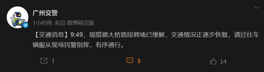 @廣州交警 發佈交通消息:4月22日9:49,現獵德大橋路段擁堵已緩解,交通情況正逐步恢復,請過往車輛服從現場民警指揮,有序通行。