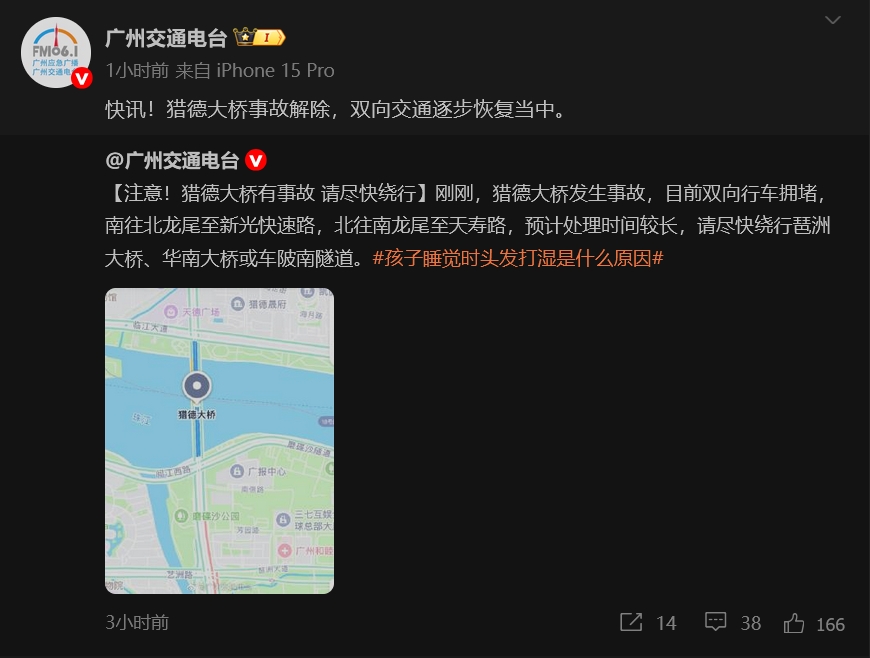 據@廣州交通電台 此前消息,4月22日早高峯期間,獵德大橋發生事故,目前雙向行車擁堵,南往北龍尾至新光快速路,北往南龍尾至天壽路,預計處理時間較長,請儘快繞行琶洲大橋、華南大橋或車陂南隧道。隨後,@廣州交通電台 通報,獵德大橋事故解除,雙向交通逐步恢復當中。