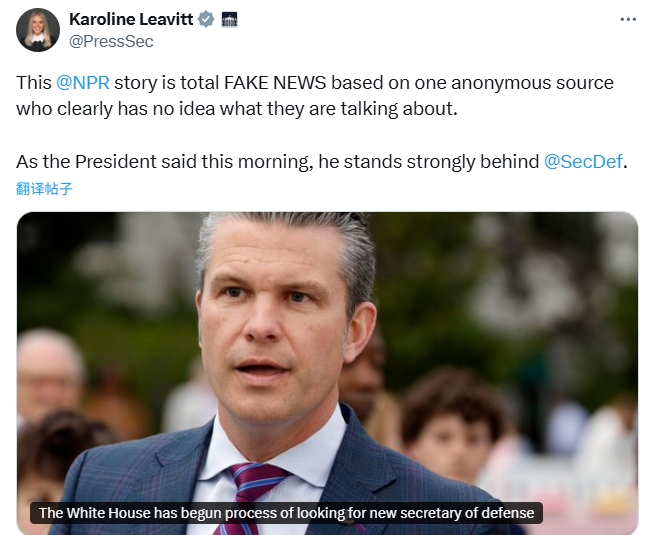 消息發佈不久後,白宮新聞秘書萊維特迅速在社媒平台X上發文闢謠,斥責NPR關於“白宮物色新任防長”的報道是“假新聞”,還稱那名被採信的匿名消息人士“顯然不知道自己在説什麼”。