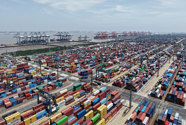 2025年4月20日,上海港一碼頭堆積的出口集裝箱。 視覺中國