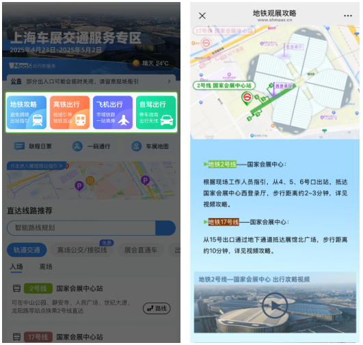 以乘地鐵前往現場為例,點擊【地鐵攻略】,就能自動跳轉地鐵觀展攻略頁面,提供地鐵線路各個出站口信息及視頻指引,用户可據此尋找最近的展會入口。